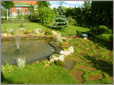 В комплекс работ выполняемых нашей компанией входит устройство  газонов, водоёмов, альпийских горок, подпорных стенок, цветников,  обрезка и кронирование деревьев, установка систем автоматического полива, систем освещения, дренажа.